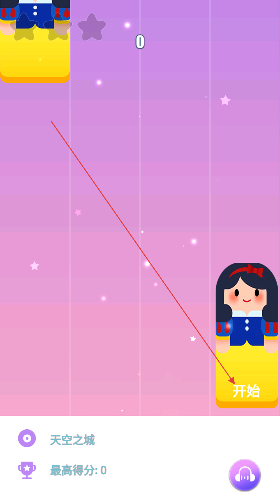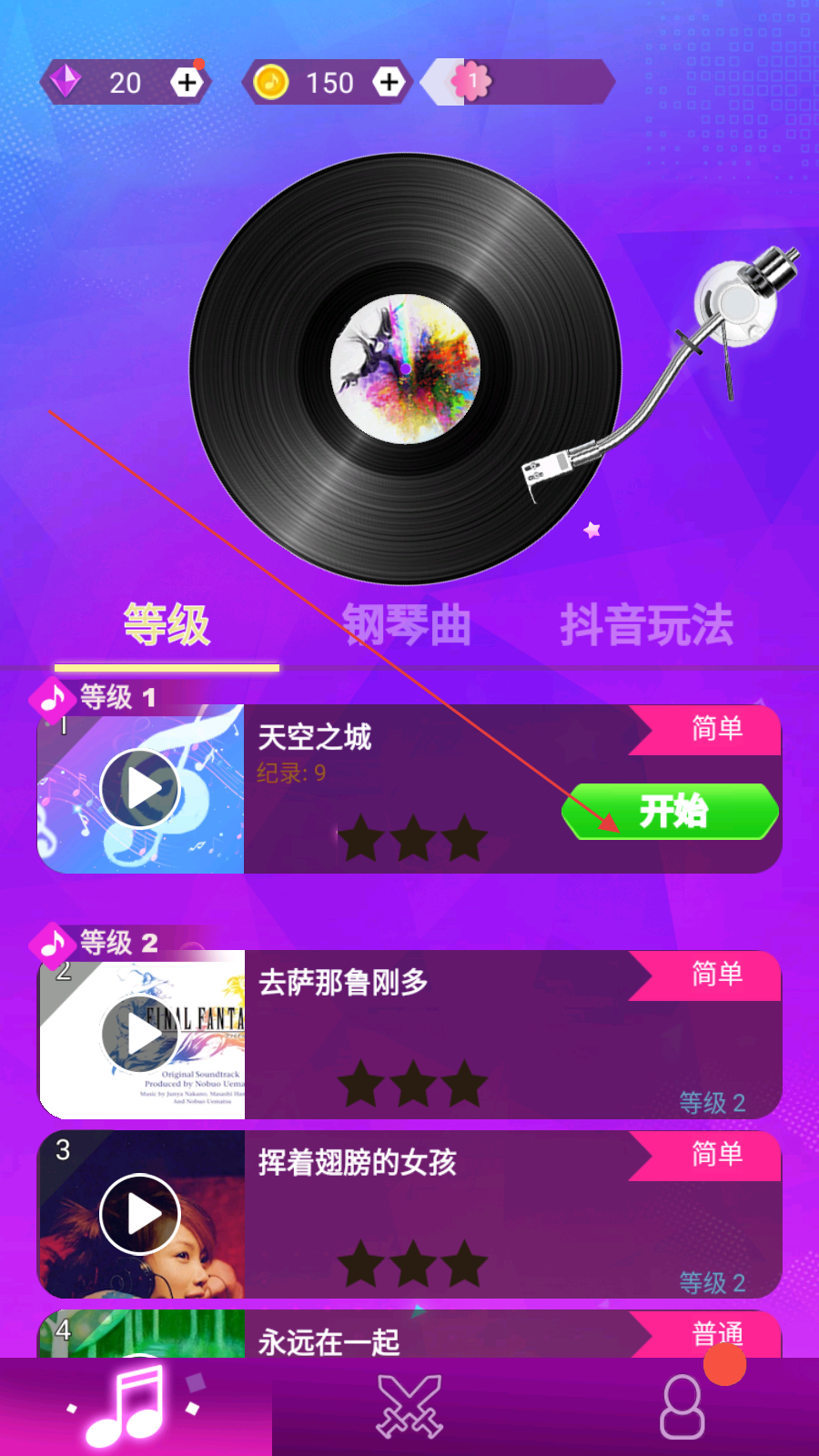 1、在歌曲选择界面,选择等级1的天空之城,点击绿色【开始】按钮进入游戏。