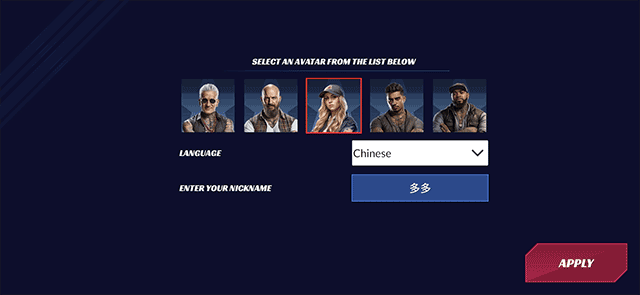 启动游戏后,在语言设置界面选择中文,输入个性化司机昵称并点击“APPLY”确认生效;