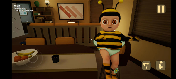 返回一楼,靠近婴儿并选择换装选项,黄衣婴儿即刻披上蜜蜂皮肤,神态与氛围随之悄然转变。