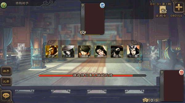 选将阶段采用交替选取机制:后手方先从公共六将池中选定一名武将加入己方备选;随后先手方从中挑选两名;接着后手再选两名;最后由先手补足最后一席。双方各自确定首发出场武将后正式开局。