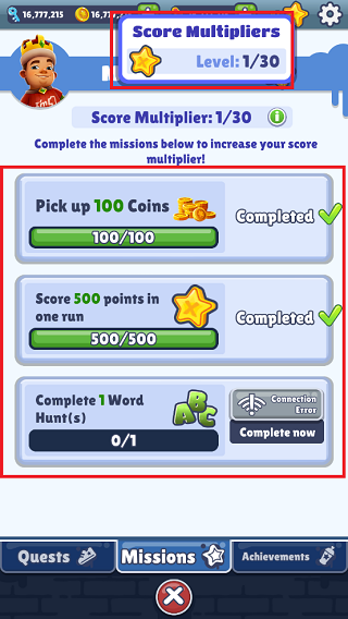 分数等级任务集中展示在任务中心,完成指定距离、收集数量与连击次数三项子目标,即可提升等级并激活更高倍率加成。