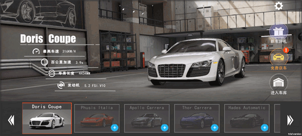 启动游戏后直接进入主车库界面,所有已拥有的车辆清晰陈列,点击任意一辆即可开始试驾。