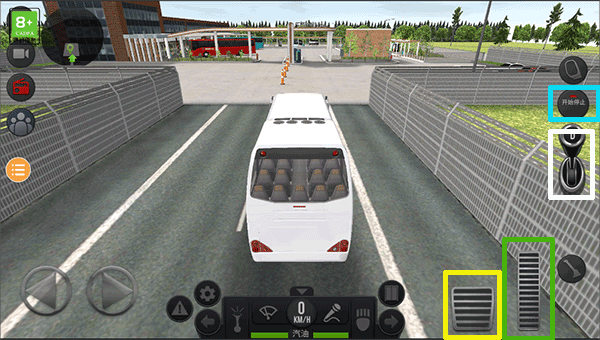 正式发车前,熟悉操作界面:蓝色方框控制车辆启动,绿色区域为油门,黄色按钮用于刹车,白色区域则切换前进或倒车方向。
