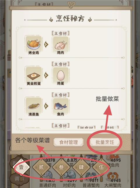 进入客栈后厨,通过“烹饪秘方”可进行批量烹饪操作。