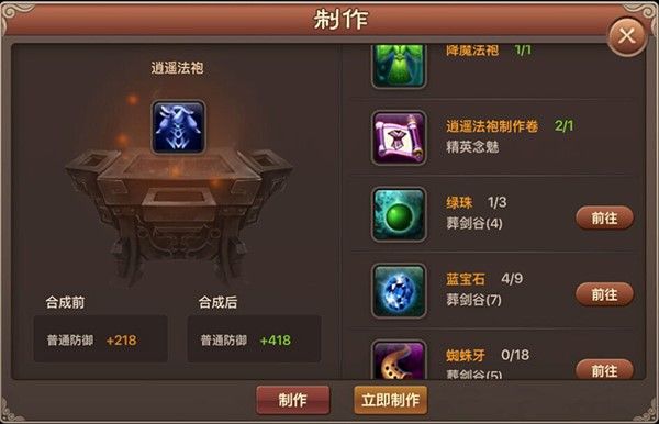 制作高级装备需低级装备、高级装备制作卷轴及特定材料。装备品阶依次为降魔、逍遥、朱雀等。