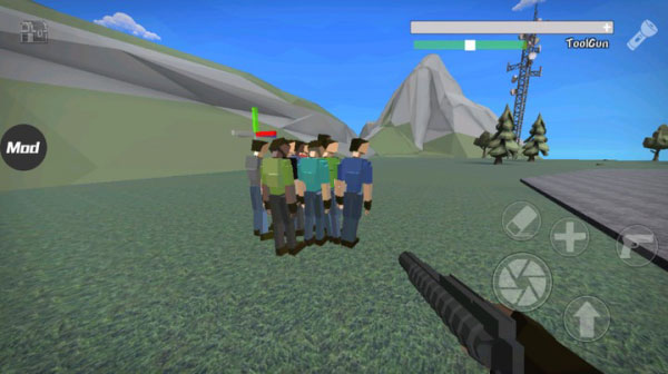 操作方式直观易上手:左侧控制角色移动,右侧负责射击。点击左上角可切换当前武器。使用武器对准物体点击,会生成蓝色引线,通过滑动屏幕即可拖动物体调整位置。