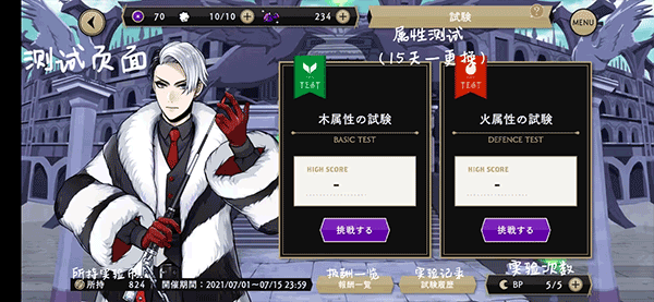 试炼系统设有木、水、火、无属性及全属性五种类型,每十五天轮换一次卡片组合,包含两种属性魔法,可通过升级提升攻击力。