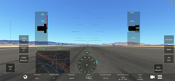 再次点击PAGE进入驾驶界面,GEAR控制起落架,起飞后收起,降落前放下。BRAKES为刹车,起飞前需踩住刹车将油门推至100后再松开;降落前同样需使用刹车。A/P开启自动驾驶,FLAPS为襟翼,起飞前通常放至25°以缩短滑跑距离,升空后收回。SPOILERS是扰流板,降落前打开,接地后收回。ALT用于设定巡航高度,爬升至目标高度后激活。RUD控制方向舵,日常飞行中较少使用。CAM切换视角,MENU返回主菜单。