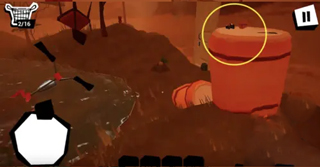 - 第一个玩偶位于门口左手边的黄色桶顶部。先跳上旁边的石头,再跃至桶上即可拾取。