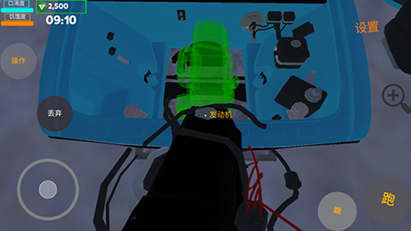 4、进入车库后,你会发现车辆处于未组装状态。你需要逐一拾取零件,并将它们精准安装到对应位置:对准目标部件,点击左上角“操作”按钮进行放置与固定。完成全部组装后,方可进入驾驶舱。