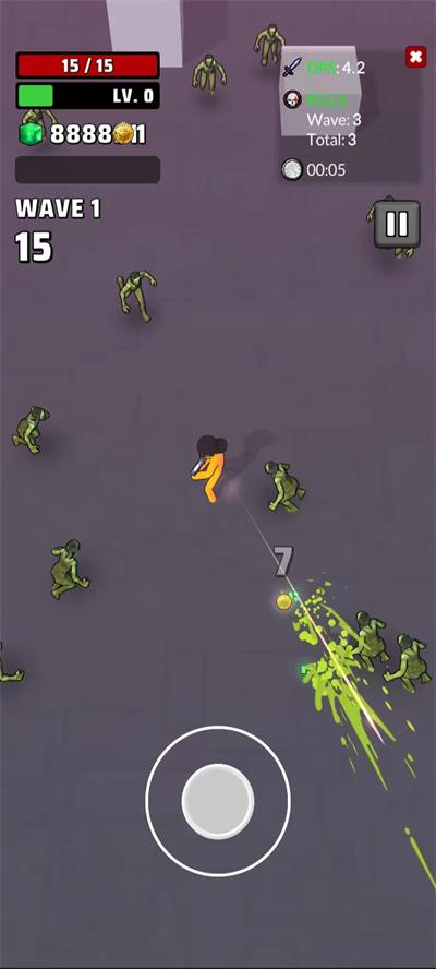 4、拖动下图这个滑块,控制人物的移动,当有敌人的时候,武器会自动开火;注意看,当击杀敌人的时候,绿色的晶体以及金币,玩家可以进行收集,收集到一定数量可以用来购买物品,当然,玩家还可以攀爬到灰色的石柱子上以获得优势;