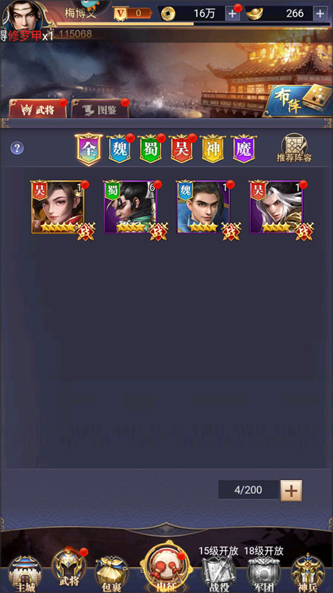 从主界面底部导航栏进入“武将”模块,点击“推荐阵容”即可查看当前战力适配的主流配置。