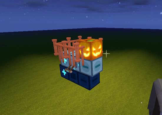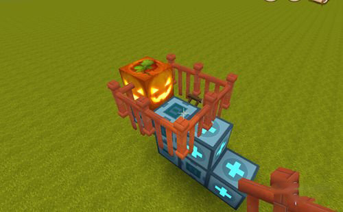 用南瓜灯嵌入车体前端提供夜间照明,栅栏围合四周防止角色意外跌落。