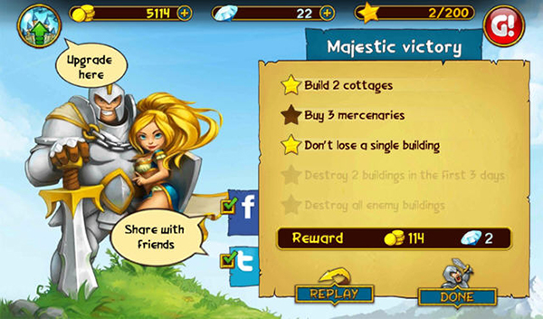 第3关:开局花费25钻石购入寺庙,随后填满村庄空位,优先提升城堡等级再强化村庄。暂不招募士兵,静待第三日敌军退却后清空村庄,转而全力建造寺庙。入夜前于阵线末端部署一名泰坦吸引火力,随后持续积累信仰值,凑齐11000后召唤四名泰坦,以绝对力量碾压敌方阵地。