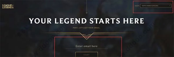 访问美服官网前请确保加速器已开启,否则无法正常加载页面。进入官网后,右上角默认显示“北美”,如需注册其他区域账号,可手动切换对应服务器选项。填写有效邮箱地址(QQ邮箱等常用邮箱均可),点击“START”进入下一环节。