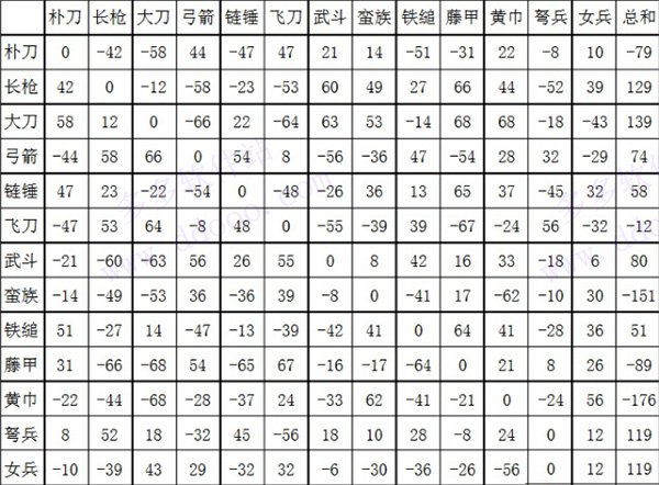 兵种相克遵循长克短、短克弓、弓克长的基本法则,但存在特例。弩兵对朴刀兵拥有额外8%克制加成,同系兵种间克制幅度不超过30%。