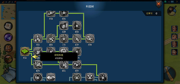 右下角斧头图标是建设入口,普通住宅拖拽放置后需等待建造完成;右上角移民按钮是人口引擎,持续补充劳动力保障各环节运转;左侧药品图标通往科技殿堂,农业、净水、石工术等早期科技,直接决定资源积累速度与城市抗风险能力。