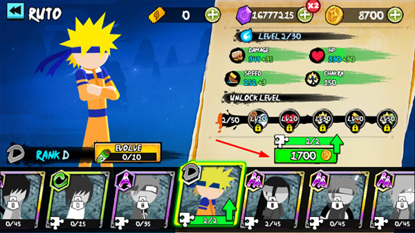 在角色列表中选择任意忍者,详细属性一目了然,点击“Upgrade”即可开启强化流程。