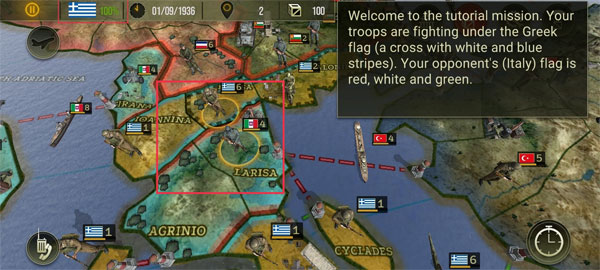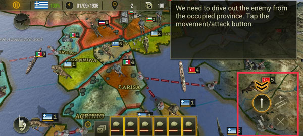 游戏初始阶段,你的部队在希腊蓝白十字旗帜下集结,敌方则以意大利红白绿三色旗为标识。确认双方阵营后,依据所控省份归属,选择对应作战群组展开部署。进入战斗界面,点击右下角箭头按钮移动部队,向敌占区域发起推进。当目标地块边缘浮现红色高亮边框,即表示已进入可攻击范围。选定敌方据点后,调遣周边友军前往支援,并再次点击右下角指令键完成攻击确认。若右下角图标变为锁定状态,说明该单位本回合行动权限已耗尽,此时需点击相应按钮结束当前操作,进入下一回合。完成基础引导后,即可正式踏入广袤的战略世界。