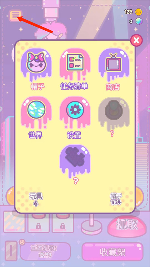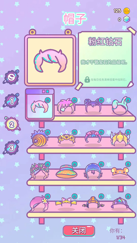 左上角【三条杠】拉开菜单,选【帽子】,架子上摆着绒布渔夫帽、藤编小凉帽、缀着铃兰的发箍,帽檐下还压着一行小字:“抓满20次彩虹扭蛋解锁”。