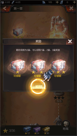 成功击退全部敌波后,结算战斗评分与资源奖励,点击“继续”推进剧情