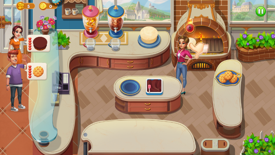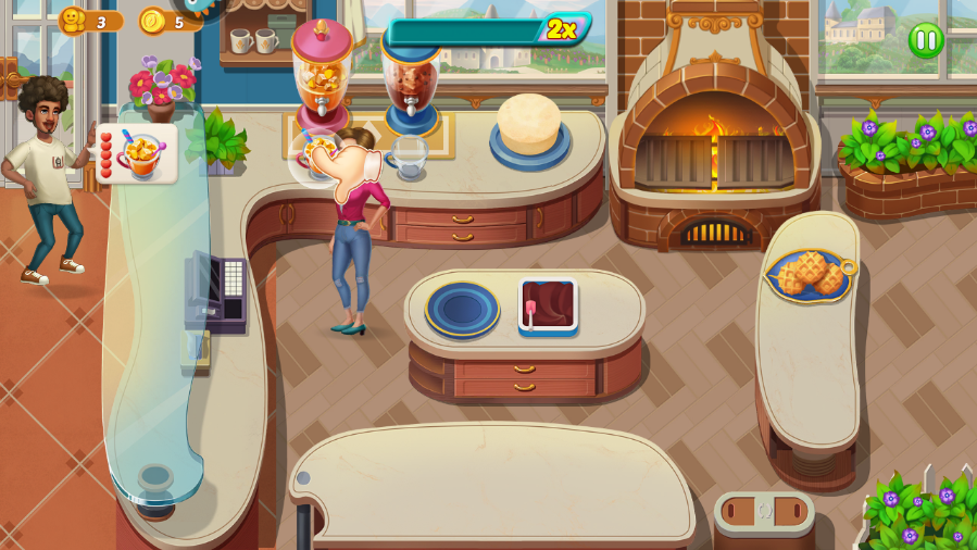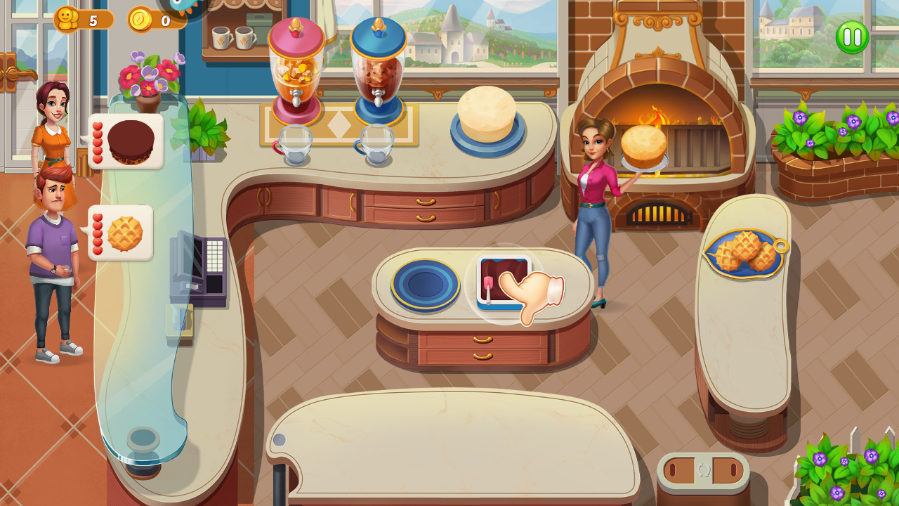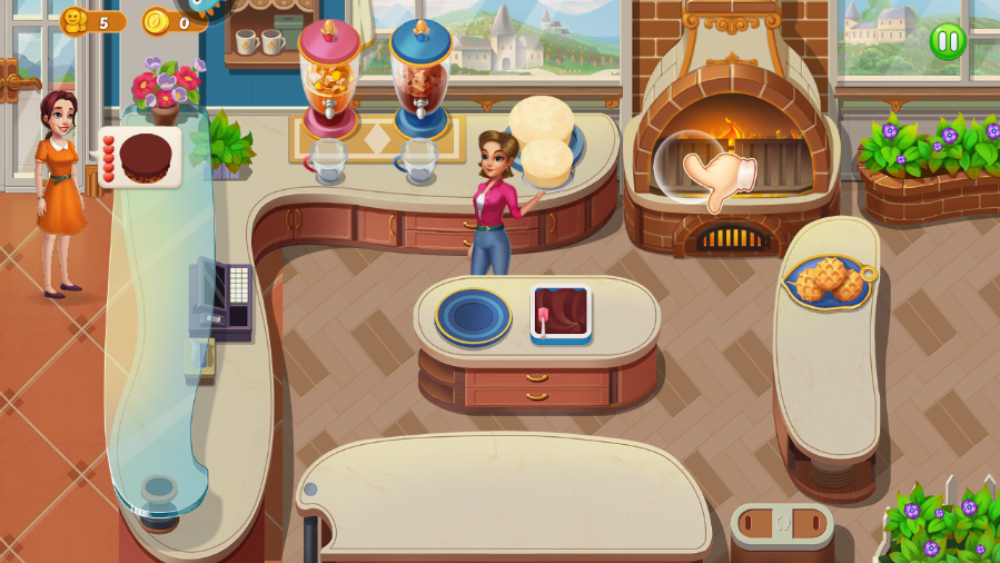 接着点击桌上可可粉完成撒粉动作,顺手还可将邻座顾客所需的饼干一并递出。