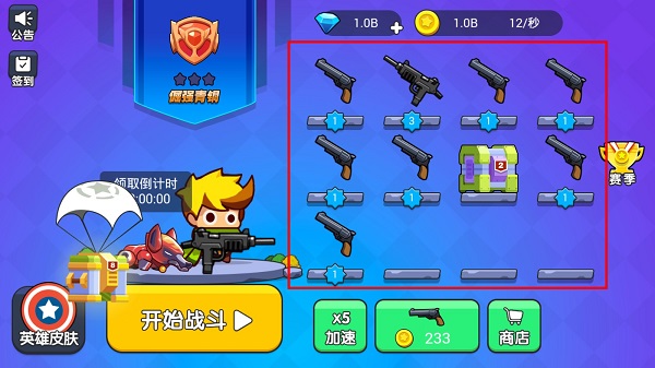 每场战斗结束后都会获得金币或钻石奖励,在主界面的合成系统中,使用金币购买基础武器,将两把同等级武器进行合成,即可升级为更强力的新武器,外形与威力同步进化。