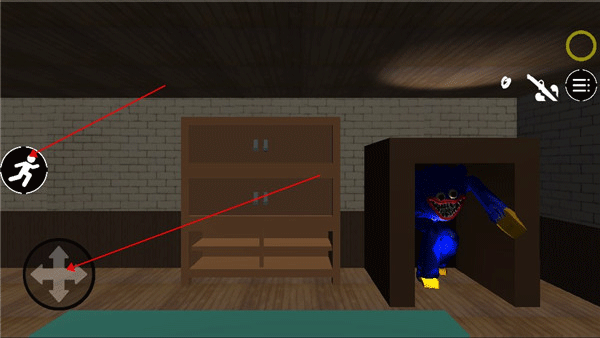 通过右侧操作图标控制角色移动,支持上下左右行走以及站立、蹲下等动作。