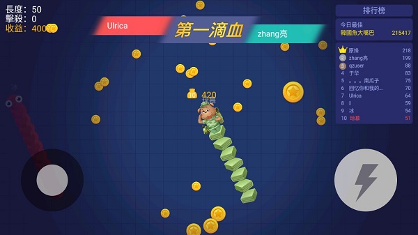 游戏核心围绕两大模式展开:通过操控摇杆移动蛇身,吞噬地图上的金币使其不断变长;长按加速键配合走位,诱使对手撞上蛇身,从而吸收其积累的金币实现快速成长。