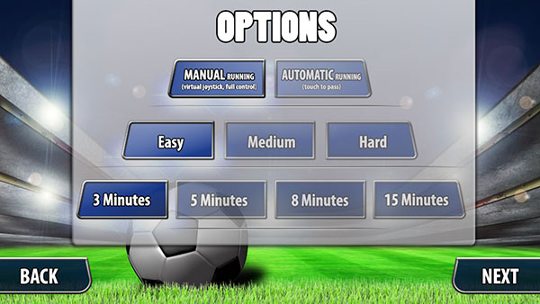 选定球队后进入“options”设置界面,可调整自动或手动奔跑、比赛难度及时长等参数