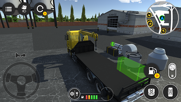 点击屏幕下方切换至吊车模式,通过滑动控制轮盘精准移动吊臂,将所需货物逐一装载到运输车上。