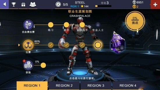 点击地图可进入三大主要模式:自由搏击、比赛和获取资源。自由搏击模式专为新手设计,帮助玩家熟悉操作逻辑,快速上手。