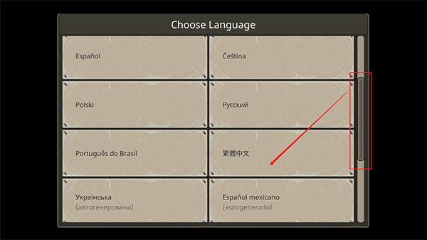 首次启动游戏时需手动选择语言,向下滑动找到“繁体中文”并点击确认即可完成切换。