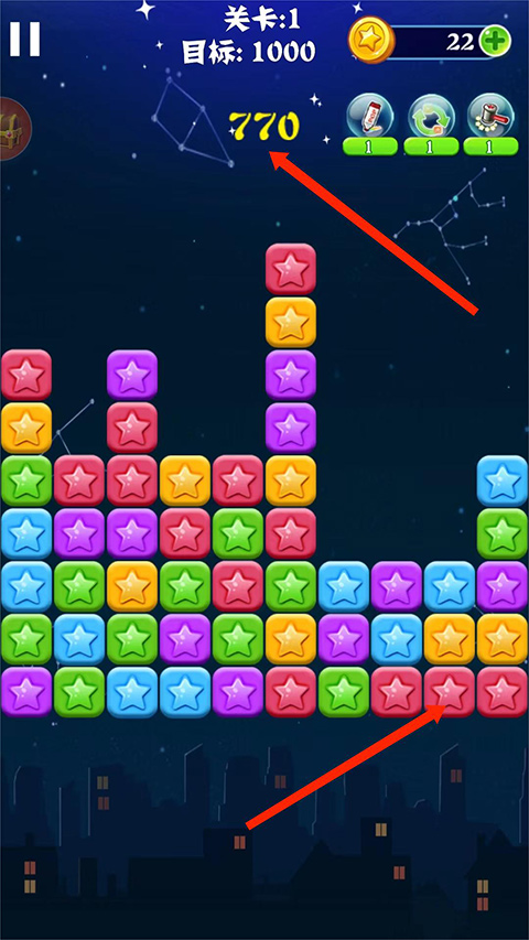 屏幕上方实时显示当前分数,努力向目标靠近,优先消除三颗及以上同色星星以获取更高得分,