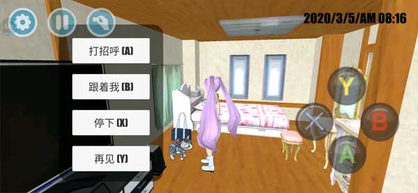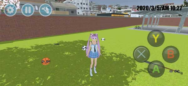 实际游戏中的角色外观可能与编辑界面略有差异。初始位置设在女主角家中,房间布置充满少女气息,内有家具、一只可互动的小猫和一个可携带上学的包包。与小猫或学生对话时提供四个选项:打招呼、跟我来、停住、再见;与老师仅能打招呼或道别;而与男主角互动则包含接吻等亲密选项。家中支持随时更换衣物。