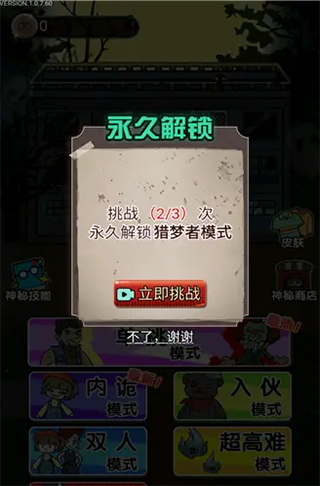 在主界面选择猎梦者模式即可尝试扮演猛鬼角色。首次体验需连续完成三次挑战方可永久解锁该模式。作为猎梦者,核心目标是潜入人类房间并破坏床铺,每次成功破坏都能获得金币奖励。若自身等级不足,则无法击破房门,导致任务失败。战斗中若受伤,可前往墙边的医疗箱进行治疗。当等级足够高时,便能强行破门而入,捕获入梦者取得胜利。