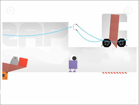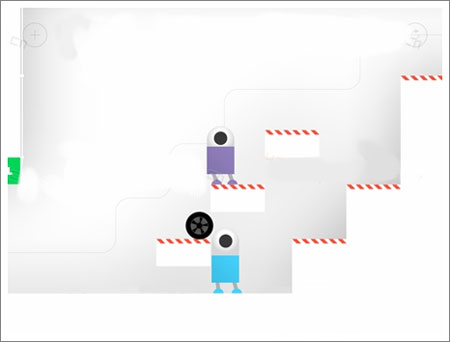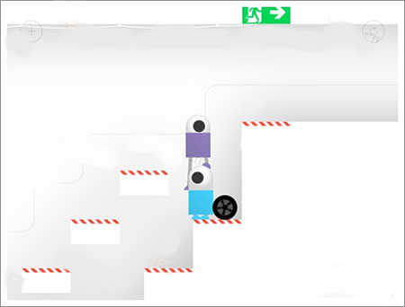 两个机器人借助轮胎向上攀爬。接近终点时,先让紫色机器人站上蓝色机器人的头顶,再一同踏上轮胎,即可顺利通过。