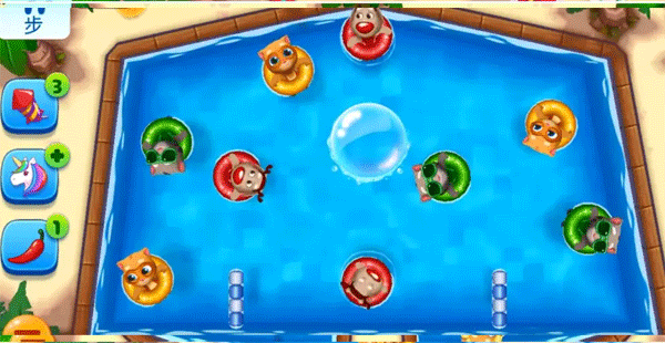 角色进入气泡后会被困住,无法行动。唯有将泳池中所有同色角色全部送入同一气泡,才能使其消失并释放角色。