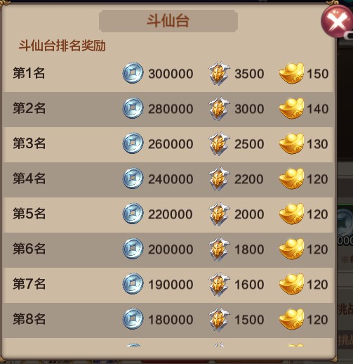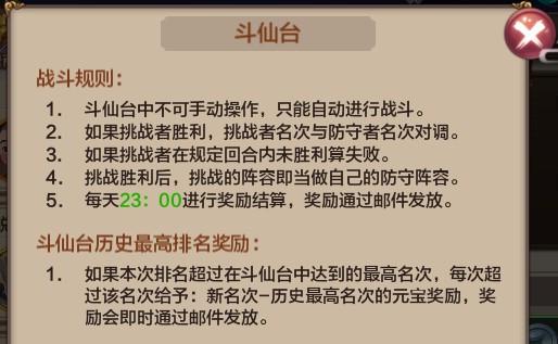 通关副本3-10后开启斗仙台,每次挑战消耗2点耐力。挑战成功且超越历史最高排名可获额外元宝奖励,登顶第一名更可领取全部系统元宝。每日23点根据当前排名发放结算奖励。