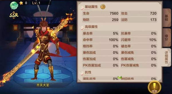 大圣初始拥有5%暴击几率与10%闪避,攻守兼备,奠定了其灵活多变的战斗定位。