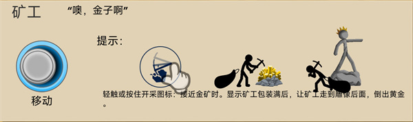 轻触或按住“开采”图标即可派遣矿工前往金矿采集资源。当矿工背包装满后,需引导其返回雕像后方倾倒黄金,完成资源收集流程。